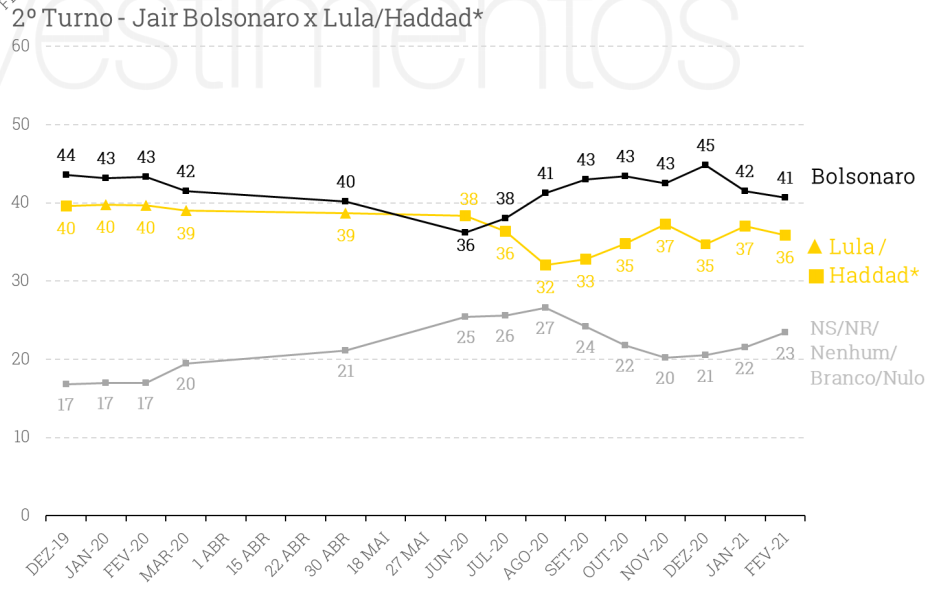 Haddad pontua 36% contra 41% de Bolsonaro, uma desvantagem de 5 pontos.
