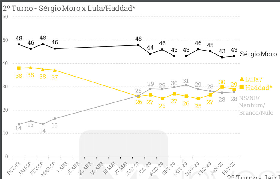 Há um cenário ainda entre Sergio Moro e Haddad, onde o ex-ministro da Justiça ganha com 14 pontos de diferença (43% X 29%), o que é um péssimo sinal para o PT, em razão de Moro representar – de maneira ainda mais forte que Bolsonaro – o que se convencionou chamar de “antipetismo”.