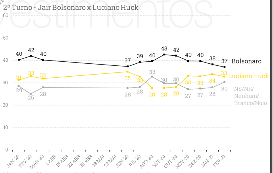 Huck fica 4 pontos atrás de Bolsonaro, pontuando 33%, contra 37% de Bolsonaro.