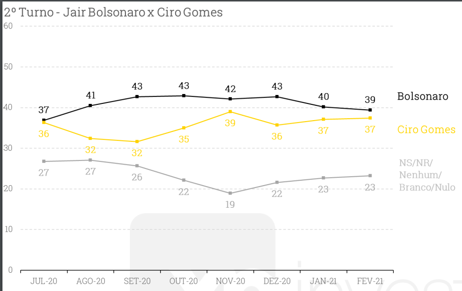 Ciro Gomes chegou a 12% em novembro e dezembro de 2019, depois caiu para 8% em algumas ocasiões, como em abril e novembro de 2020. Agora tem 11%.