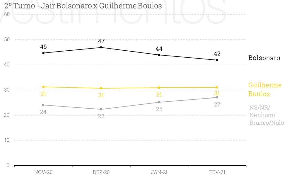 No histórico da pesquisa estimulada, temos o seguinte quadro: a pontuação máxima de Bolsonaro foi de 30%, em setembro. Hoje tem 28%.