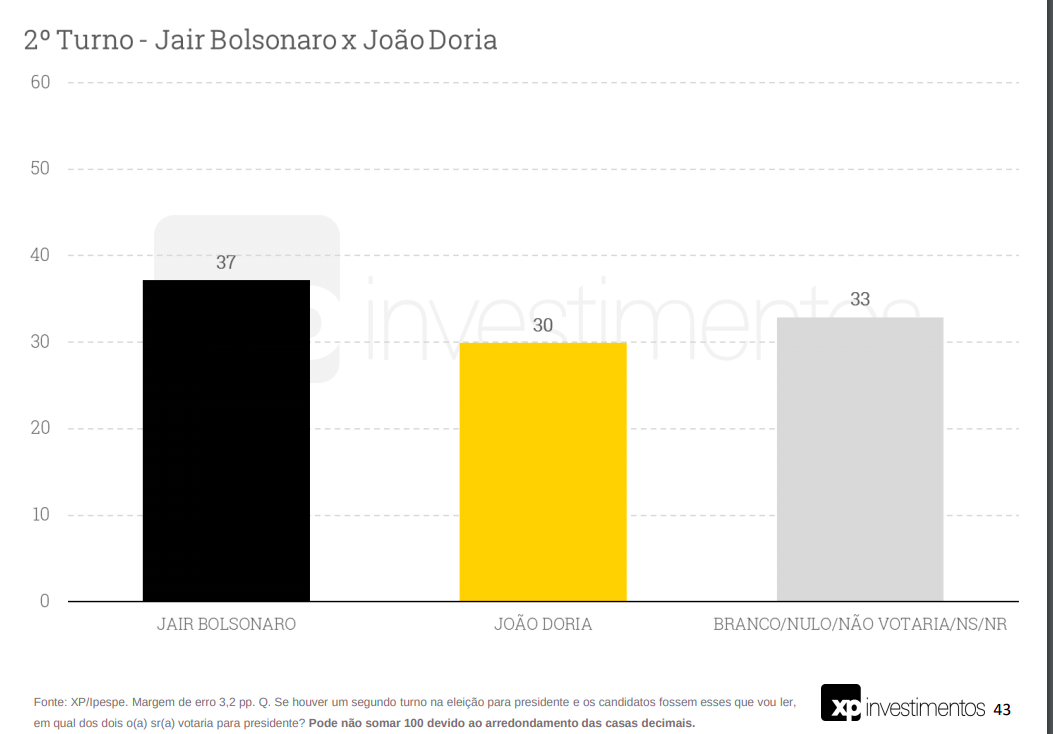 O governador de São Paulo, João Doria, fica sete pontos atrás de Bolsonaro, com 30%, contra 37% de Bolsonaro.