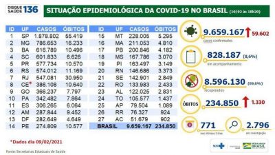 Já o total de pessoas infectadas pelo coronavírus desde o início da pandemia chegou a 9.659.167. Em 24 horas, foram confirmados pelas autoridades sanitárias 59.602 novos casos.
