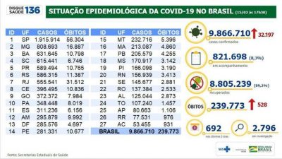 Já as mortes pelo novo coronavírus ao longo da pandemia aproximam-se da marca de 240 mil. Em 24 horas, as autoridades de saúde notificaram 528 novos óbitos, totalizando 239.773. Ontem (14), o painel de informações marcava 239.245 mortes acumuladas.
