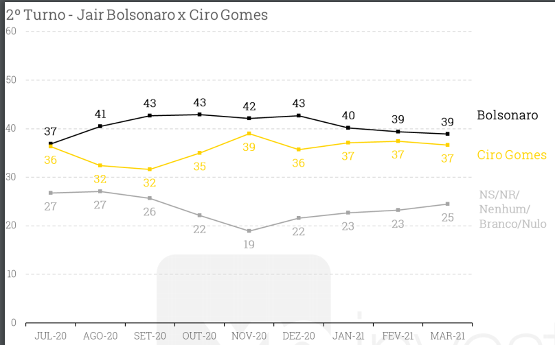 Entre Bolsonaro e Ciro, o presidente tem vantagem de dois pontos.