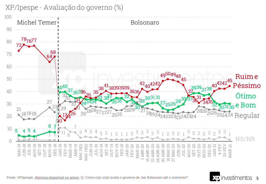 Obtivemos o relatório completo da pesquisa XP/Ipespe. Ele traz alguns gráficos interessantes, que merecem comentários. Confiram abaixo. A avaliação geral do presidente Bolsonaro piorou, chegando a 45% de ruim e péssimo e 30% de bom e ótimo. Ele já esteve pior, no início da pandemia, quando suas notas de ruim e péssimo chegou a 50%. […]