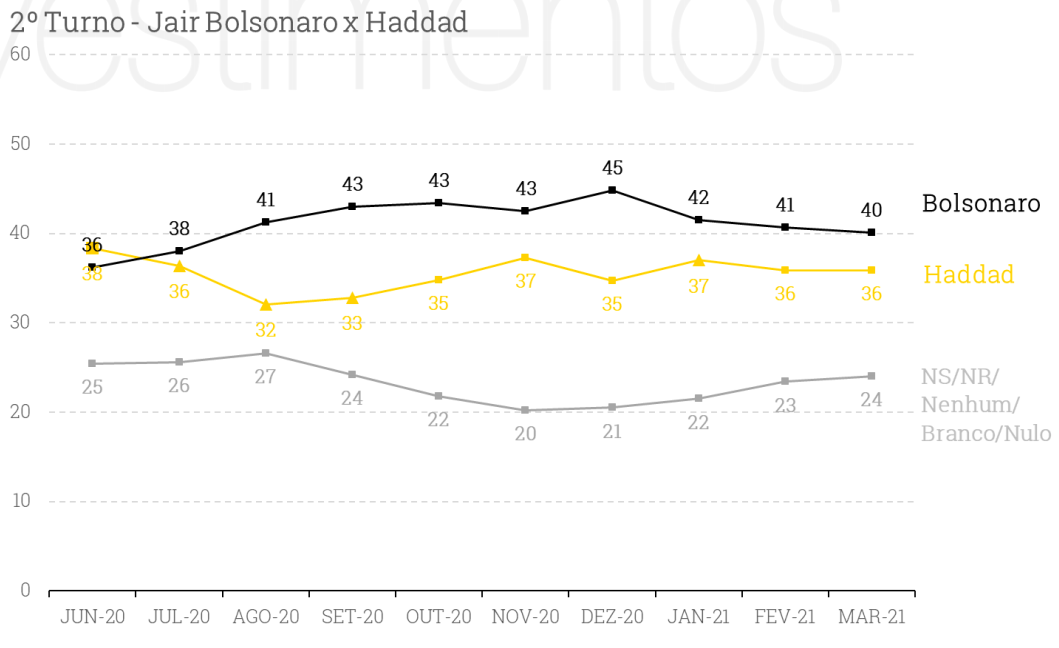 Entre Bolsonaro e Haddad, o presidente tem vantagem de 4 pontos.