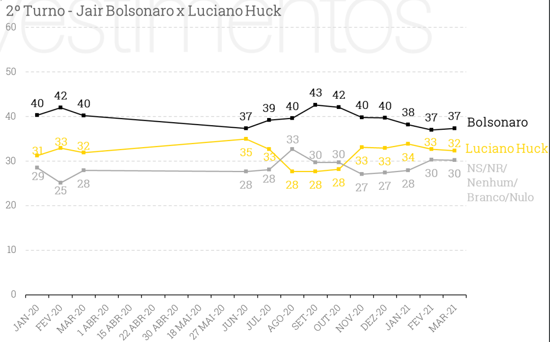 Num eventual segundo turno entre Bolsonaro e Huck, o presidente tem uma vantagem de 5 pontos.