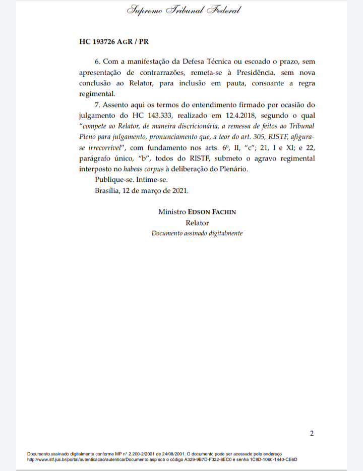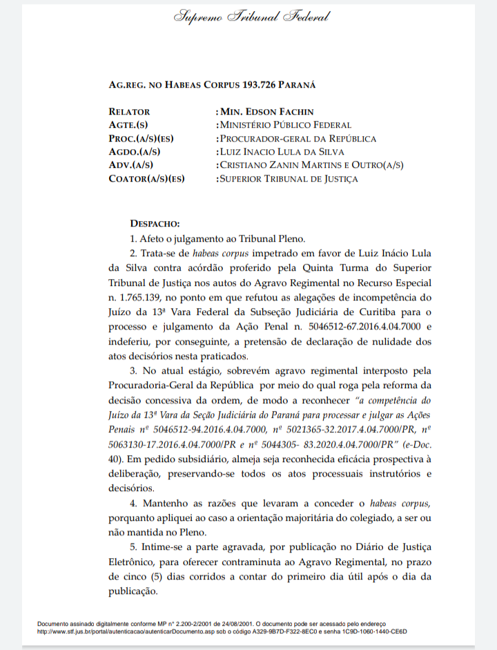 No despacho, Fachin deixa claro que “mantenho as razões que levaram a conceder o habeas corpus (a Lula), porquanto apliquei ao caso a orientação majoritária do colegiado, a ser ou não mantida no Pleno”.