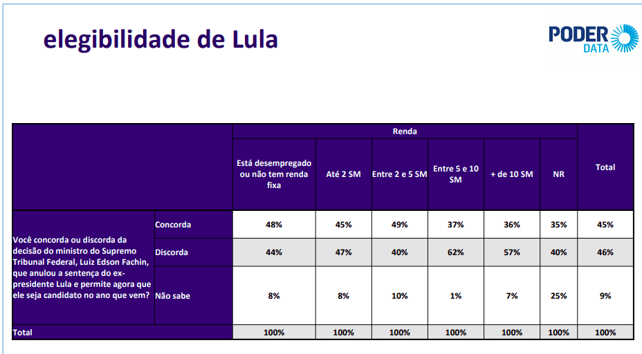 A pesquisa também sondou a opinião dos eleitores sobre a decisão do STF que anulou os processos do ex-presidente. A população segue dividida: 46% discordam, contra 45% que concordam.