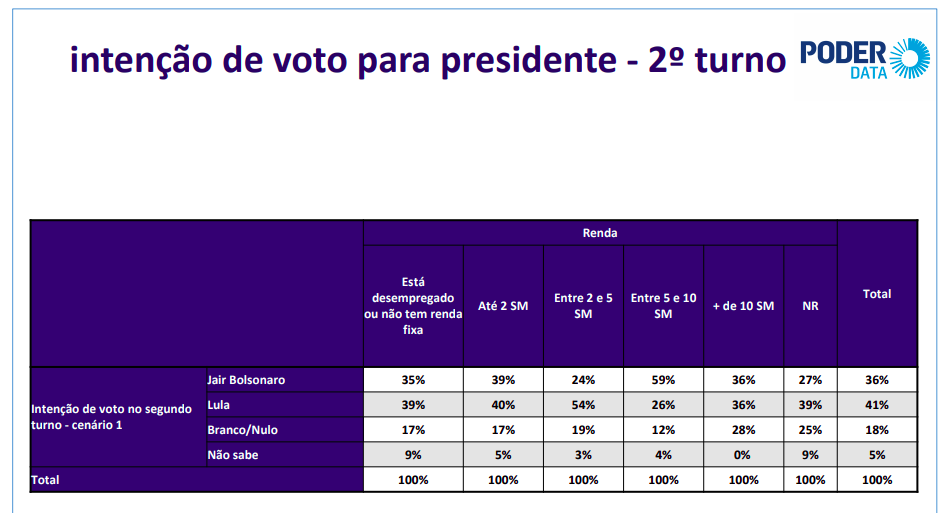 A análise dos votos estratificados mostra que a força principal de Lula está entre famílias com renda entre 2 e 5 salários, entre as quais ele pontua 45%, contra 20% de Bolsonaro.