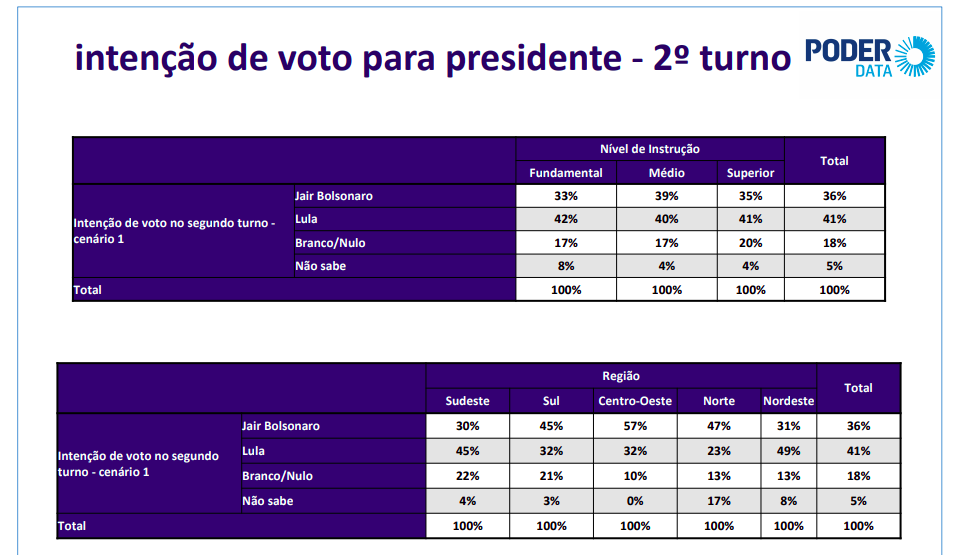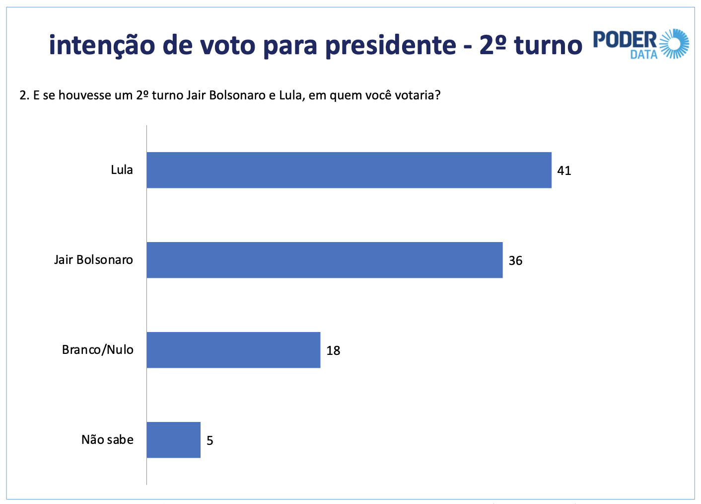 Nas projeções de segundo turno, Lula também ganha de Bolsonaro, com cinco pontos de vantagem: o placar seria de 41% X 36% em favor de Lula.