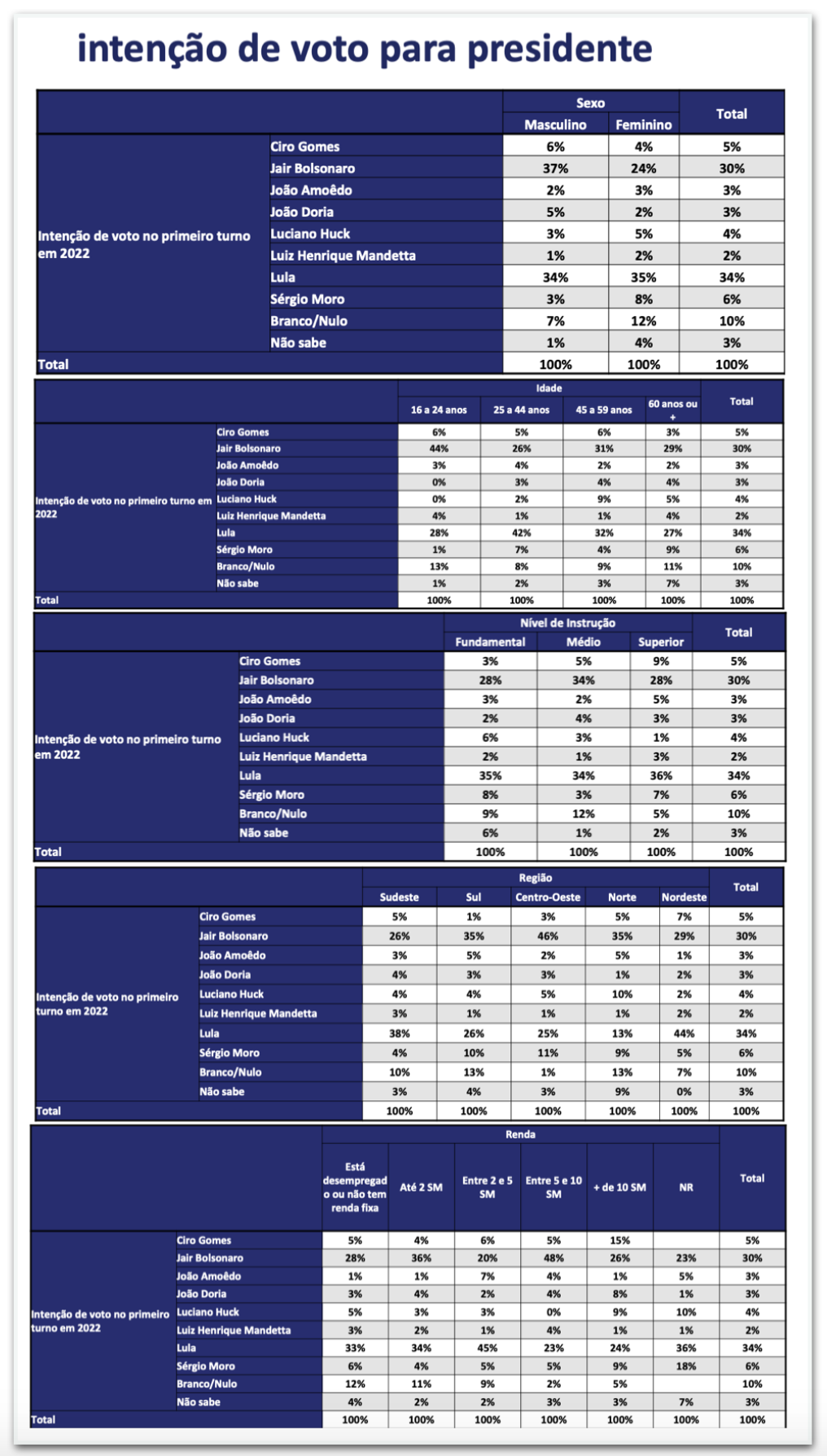A pesquisa traz um quadro extremamente polarizado, com os dois principais candidatos, Bolsonaro e Lula, recebendo 64% dos votos totais.