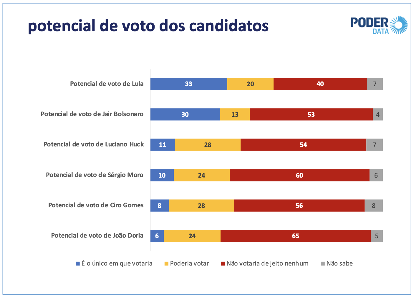 A pesquisa traz um Lula quase imbatível. Tem a menor rejeição, 40%, mais de 10 pontos abaixo de qualquer outro candidato, e o maior potencial: 53% dos entrevistados afirmaram que podem votar em Lula.