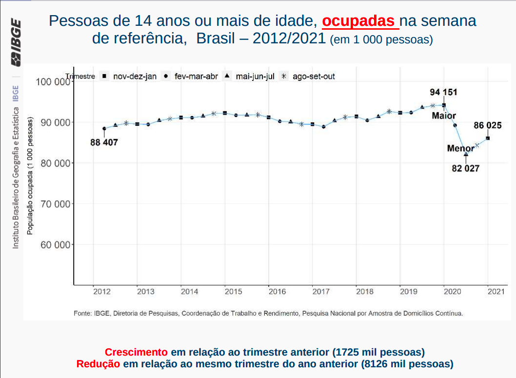 Na comparação com o mesmo período do ano anterior, houve queda de 2 milhões de pessoas no contingente de ocupados do Comércio (-11%), de 1,6 milhão em Alojamento e alimentação (-28,1%), de 1,3 milhão na Indústria (-10,3%), de 1,3 milhão em Serviços Domésticos (-20,8%), de 938 mil em Outros Serviços (-18,4%), de 702 mil em Transportes (-14,1%) e de 693 mil na Construção (-10,2%).