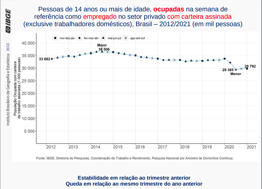 Os trabalhadores do setor privado com carteira de trabalho assinada e os empregadores foram duas categorias que mantiveram estabilidade frente ao trimestre encerrado em outubro. Mas na comparação com o mesmo período do ano anterior, o cenário é de queda. São 3,9 milhões de trabalhadores com carteira assinada a menos no setor privado. Já a queda no número de empregadores foi de 548 mil pessoas.