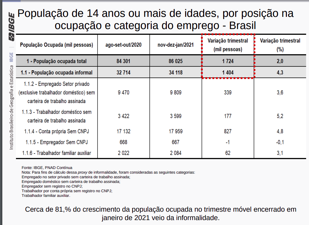A maior parte desse aumento na ocupação veio da população informal. O número de empregados sem carteira assinada no setor privado subiu 3,6% em relação ao trimestre anterior, o que representa um aumento de 339 mil pessoas. Já os trabalhadores por conta própria sem CNPJ aumentaram em 4,8% no mesmo período, totalizando 826 mil pessoas a mais. Os trabalhadores domésticos sem carteira, após crescerem 5,2% frente ao trimestre anterior, somam 3,6 milhões de pessoas.