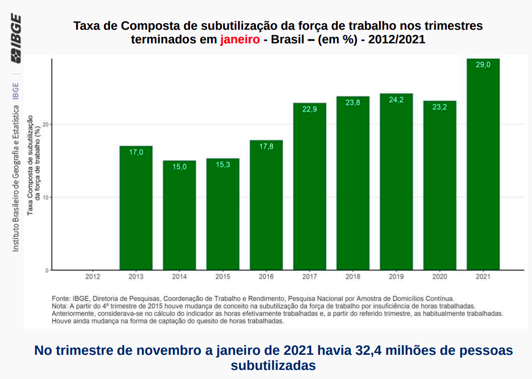 Um gráfico que chama a atenção é o percentual de subutilização da força do trabalho. Esse componente junta desemprego e subemprego. Segundo essa classificação, 29% da força de trabalho no Brasil está hoje subutilizada, o que corresponde a 32,4 milhões de brasileiros!
