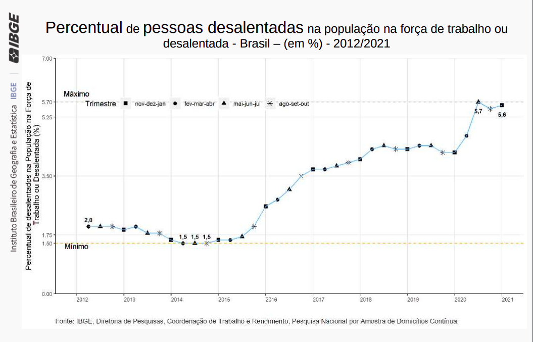 Entre eles estão os desalentados, grupo de pessoas que não buscaram trabalho, mas que gostariam de conseguir uma vaga e estavam disponíveis para trabalhar. Após uma variação de 2,3%, o que representa estabilidade frente ao trimestre anterior, eles foram estimados em 5,9 milhões de pessoas, o maior número desde o início da série histórica da pesquisa, em 2012. Em relação ao mesmo período do ano anterior, quando havia no Brasil 4,7 milhões de pessoas desalentadas, houve um acréscimo de 25,6%. São 1,2 milhão de pessoas a mais nessa situação.
