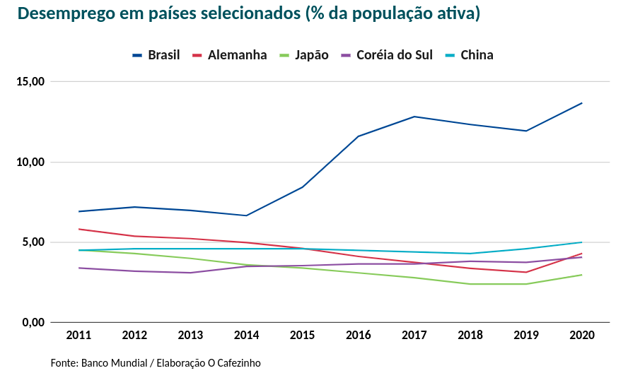Nos Estados Unidos, cujo enfrentamento ao Covid-19 foi considerado um desastre por especialistas, em virtude de um presidente desequilibrado como Donald Trump, o desemprego registrou um salto, fechando o ano em 8%, ainda assim quase a metade da taxa vista no Brasil.