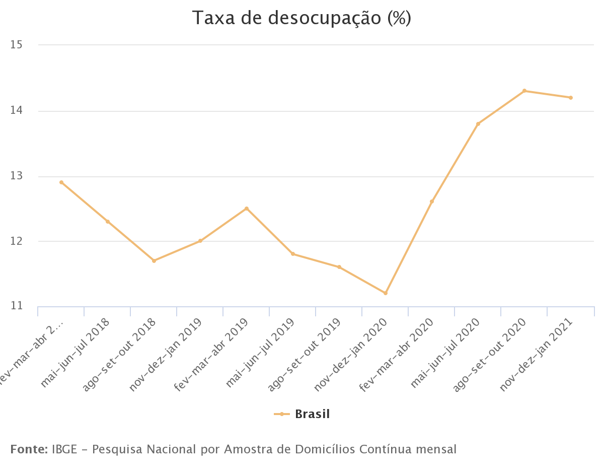 Agência IBGE — O número de pessoas desempregadas no Brasil foi estimado em 14,3 milhões no trimestre encerrado em janeiro, o maior contingente desde 2012, início da série histórica da Pesquisa Nacional por Amostra de Domicílios Contínua (PNAD Contínua), divulgada hoje (31) pelo IBGE. Embora a taxa de desocupação tenha ficado estável em 14,2% frente ao trimestre anterior, é a mais alta para um trimestre encerrado em janeiro. Já o contingente de pessoas ocupadas aumentou 2% e chegou a 86 milhões. Isso representa 1,7 milhão de pessoas a mais no mercado de trabalho em relação ao trimestre encerrado em outubro.