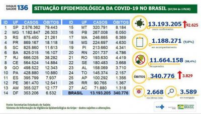 Já o total de pessoas infectadas desde fevereiro de 2020 subiu para 13.193.205. Entre ontem e hoje, foram confirmados 92.625 novos diagnósticos positivos.
