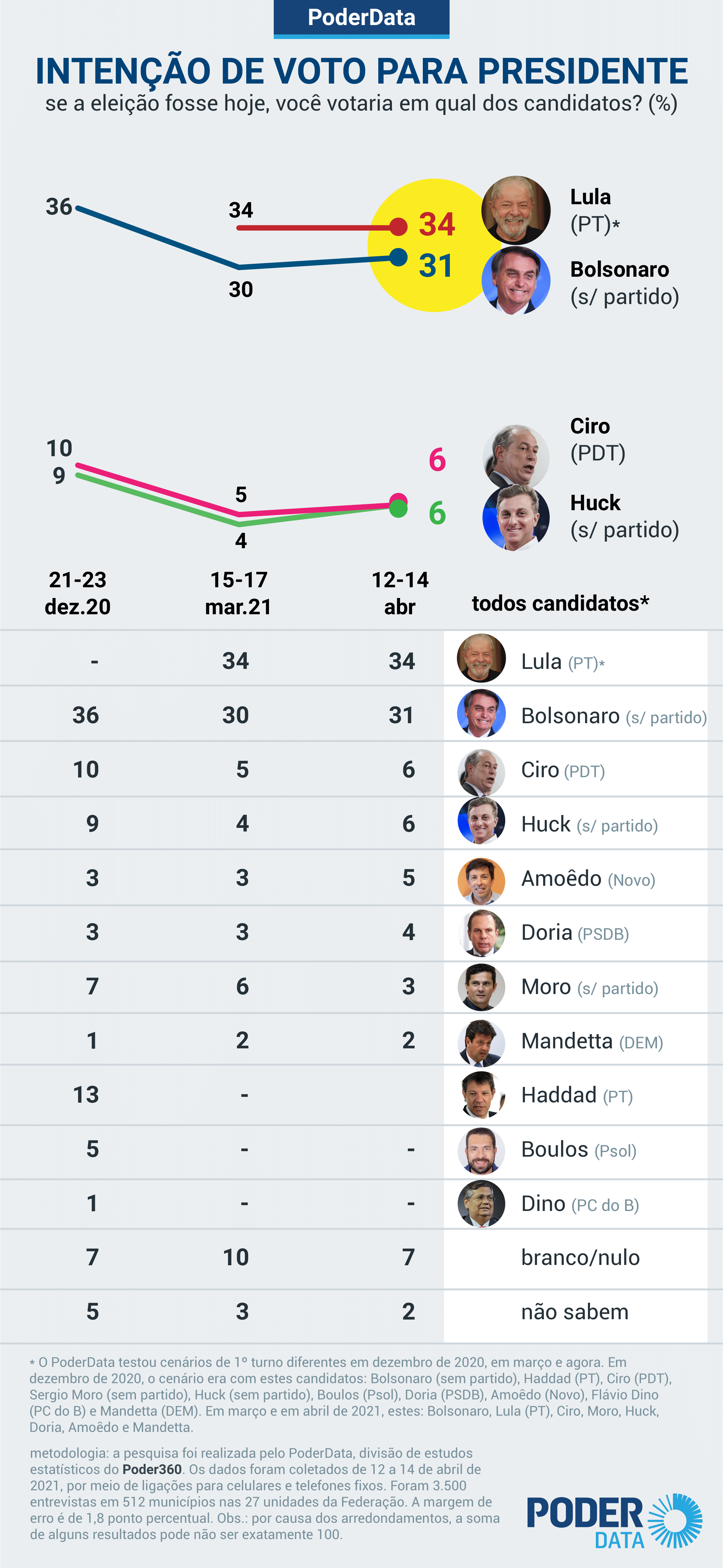 Huck, aparentemente, já está fora da disputa, após aceitar um novo contrato da Globo para assumir o lugar de Faustão. Sua pontuação no segundo turno parece, no entanto, um pouco exagerada, como se a pesquisa quisesse dar uma última “força” para que ele participe.