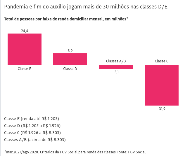Vamos aos números brutos: de agosto de 2020 a março deste ano, 32 milhões de famílias que pertenciam à chamada classe C, uma categoria que se encaixa no perfil às vezes chamado de classe média baixa, registraram queda dramática de renda, o que as levou a perda de moradia, à situação de perigosa insegurança alimentar, e a descer na pirâmide de renda para as classes D e E.