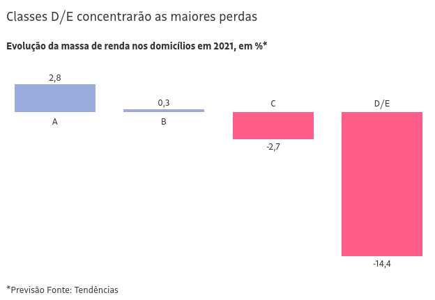 Segundo a consultora Tendências, as famílias das classes D/E devem experimentar uma perda de 14,4% em sua massa de renda. A classe C deve registrar perda de 3%.