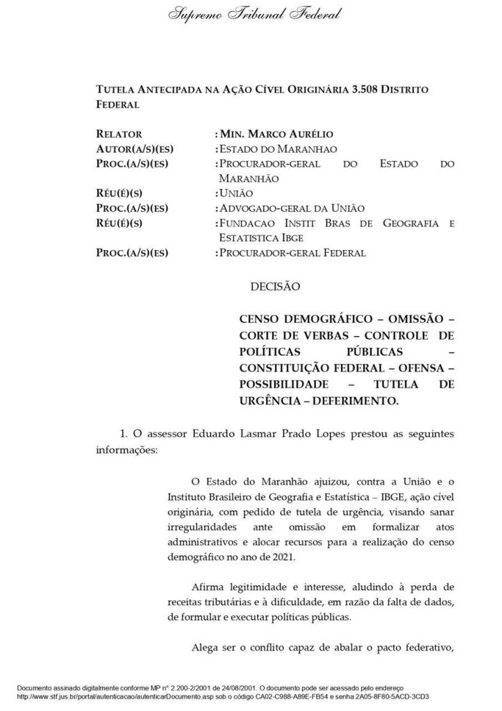Mello acolheu pedido do governador do Maranhão, Flávio Dino (PC do B) e determinou que governo faça a “adoção de medidas voltadas à realização do censo”.