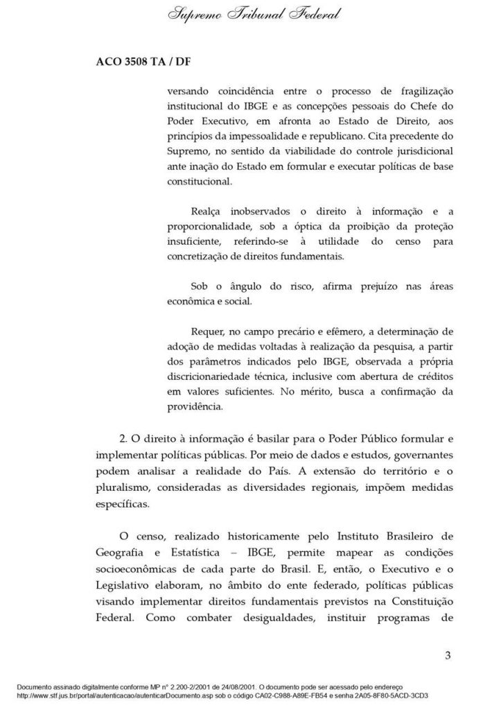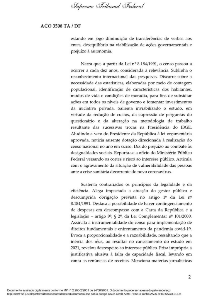 No despacho, o ministro lembrou que Governo e o IBGE “ao deixarem de realizar o estudo no corrente ano, em razão de corte de verbas, descumpriram o dever específico de organizar e manter os serviços oficiais de estatística e geografia de alcance nacional”.