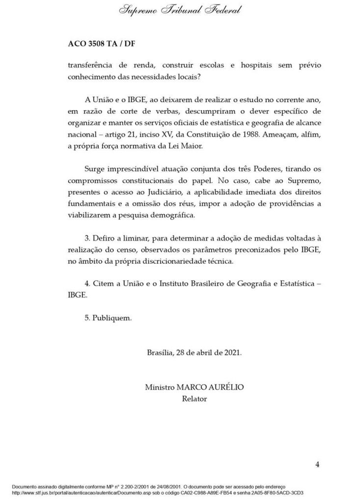 O ministro do Supremo Tribunal Federal, Marco Aurélio Mello, ordenou que o Governo Bolsonaro realizar o Censo 2021 feito pelo Instituto Brasileiro de Geografia e Estatística (IBGE). Na semana passada, o Ministério da Economia alegou falta de recursos para realizar o levantamento feito a cada dez anos.