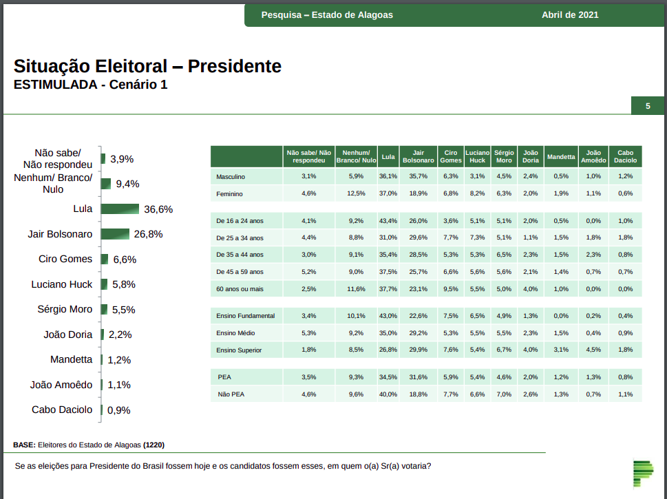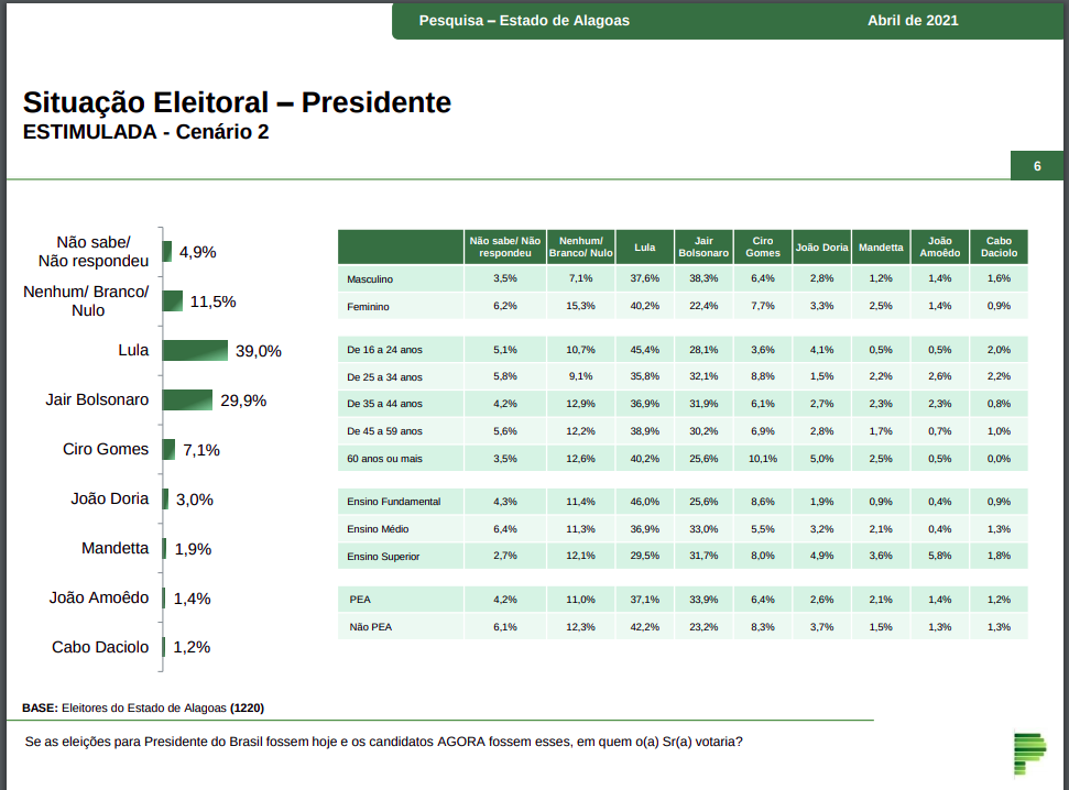 Segundo pesquisa divulgada hoje pelo Paraná Pesquisas para o estado de Alagoas, o presidente Lula teria hoje intenções de voto que variam de 37% a 39%, nos dois cenários em que participa.