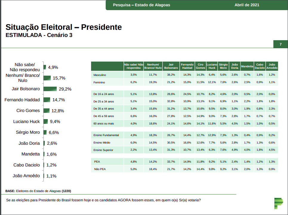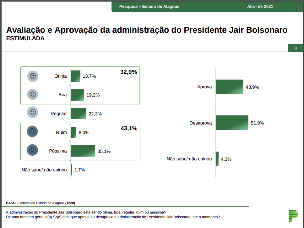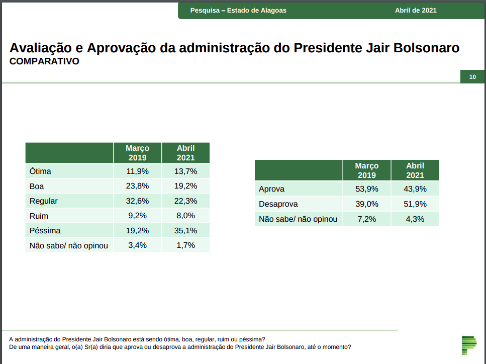 No comparativo com a última pequisa do mesmo instituto, feita em março de 2019, ou seja, logo após o início da nova administração, nota-se uma razoável deterioração do prestígio do presidente em Alagoas, embora nada realmente muito drástico. Ele tinha 54% de aprovação em março de 2019; agora tem 44%. Tinha 39% de desaprovação; agora tem 52%.