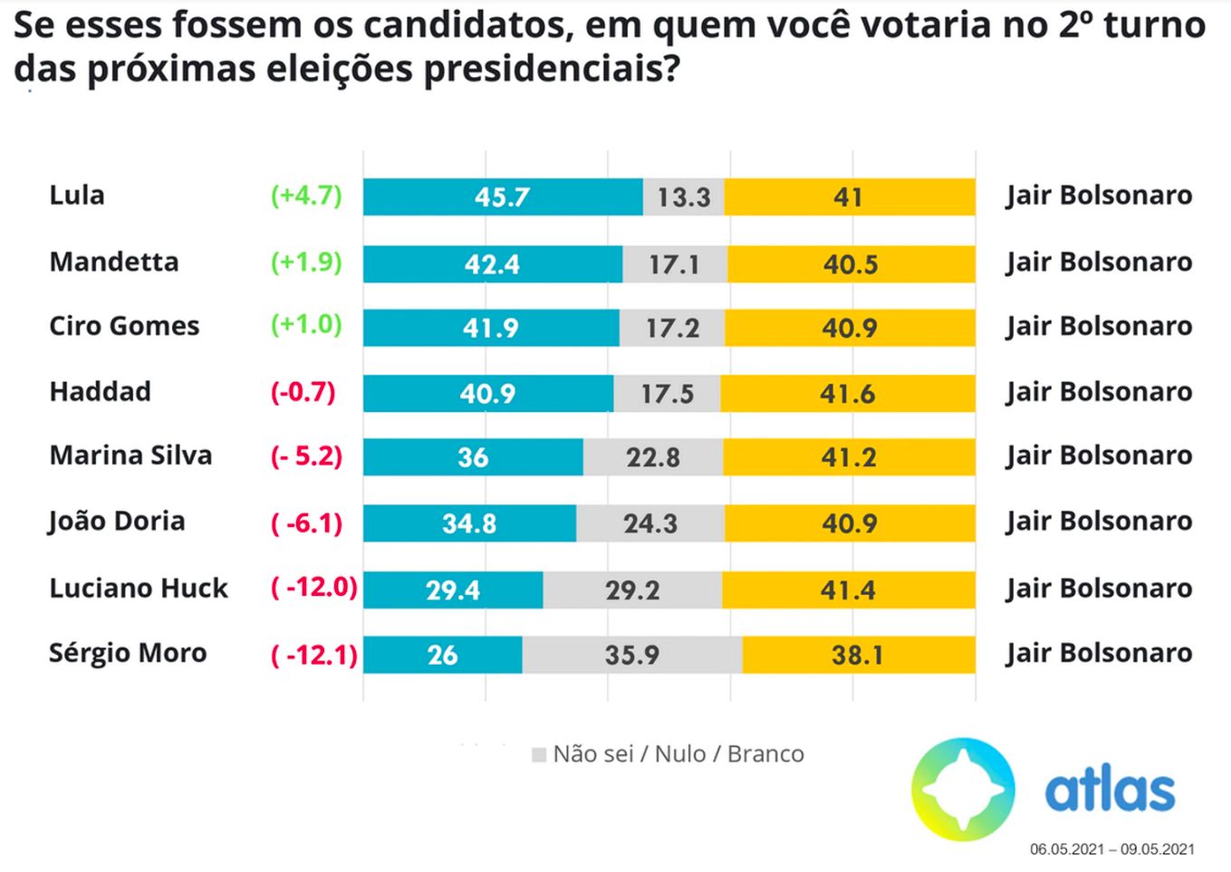 Doria, Huck e Moro, por outro lado, perderiam de Bolsonaro com diferenças de 6 pontos a 12 pontos.