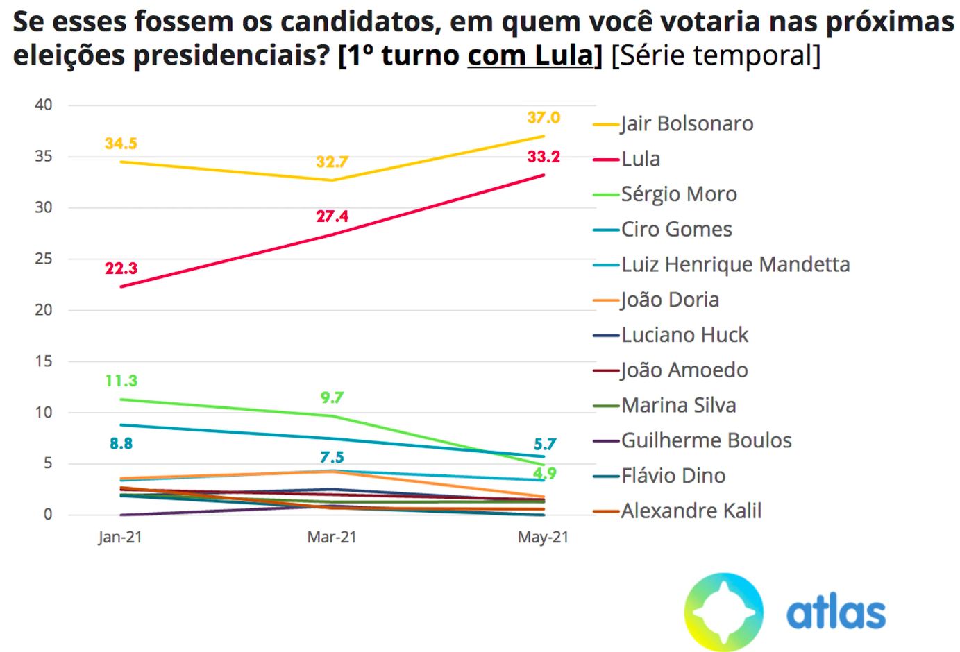 Atlas: Bolsonaro cresce para 37%, Moro evapora, Lula vence no segundo turno