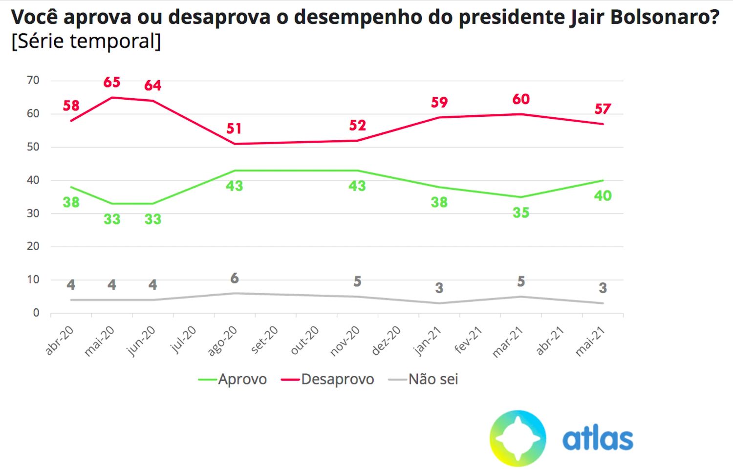 A aprovação ao desempenho do presidente subiu cinco pontos e voltou a 40%, e a desaprovação, que havia atingido 60% em março, declinou três pontos e agora está em 57%.