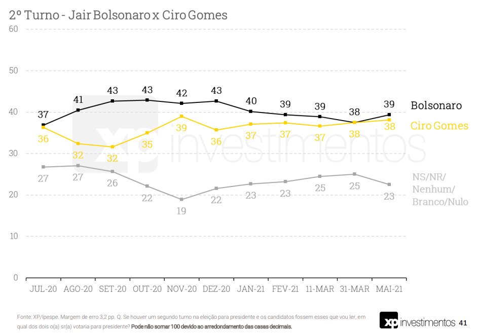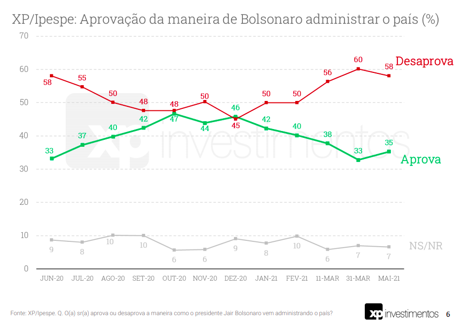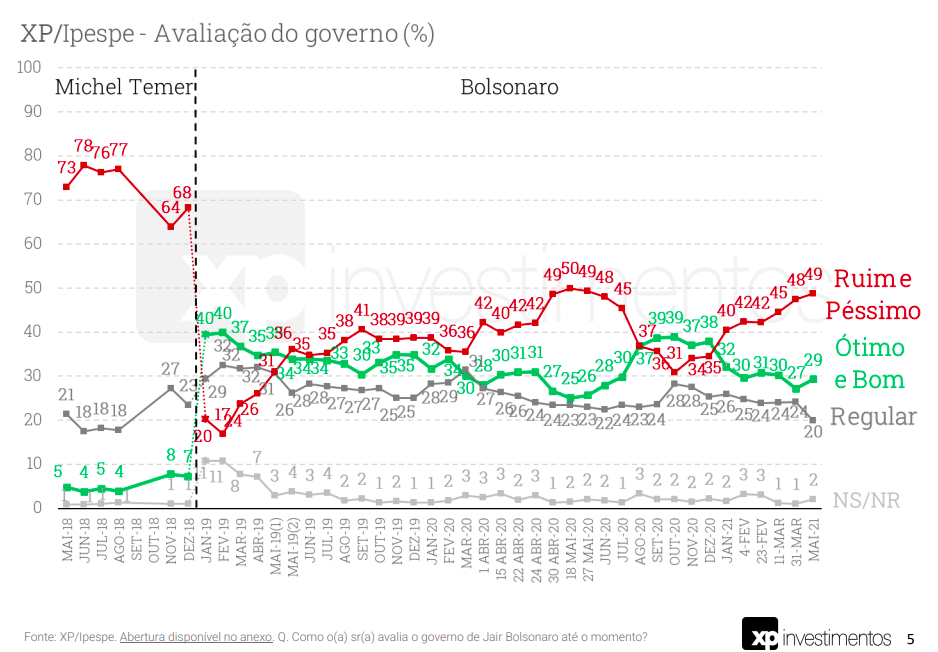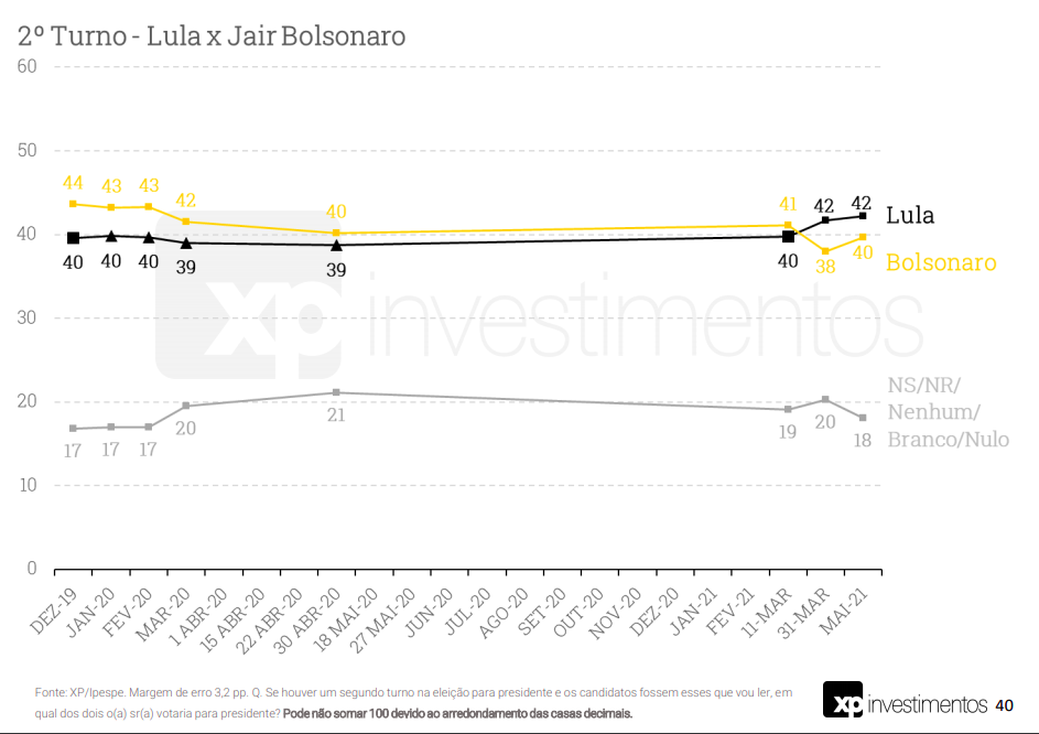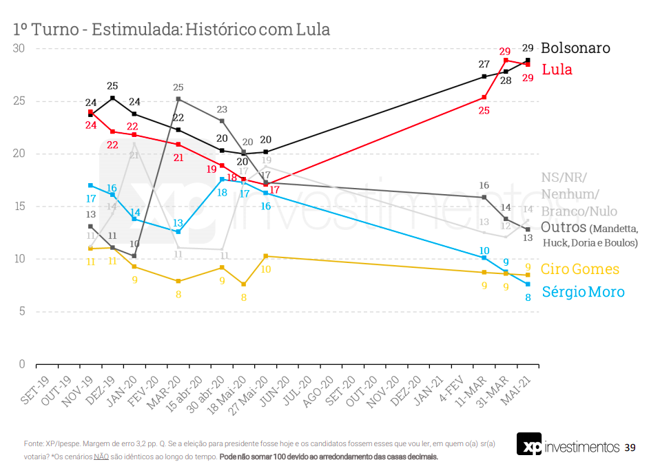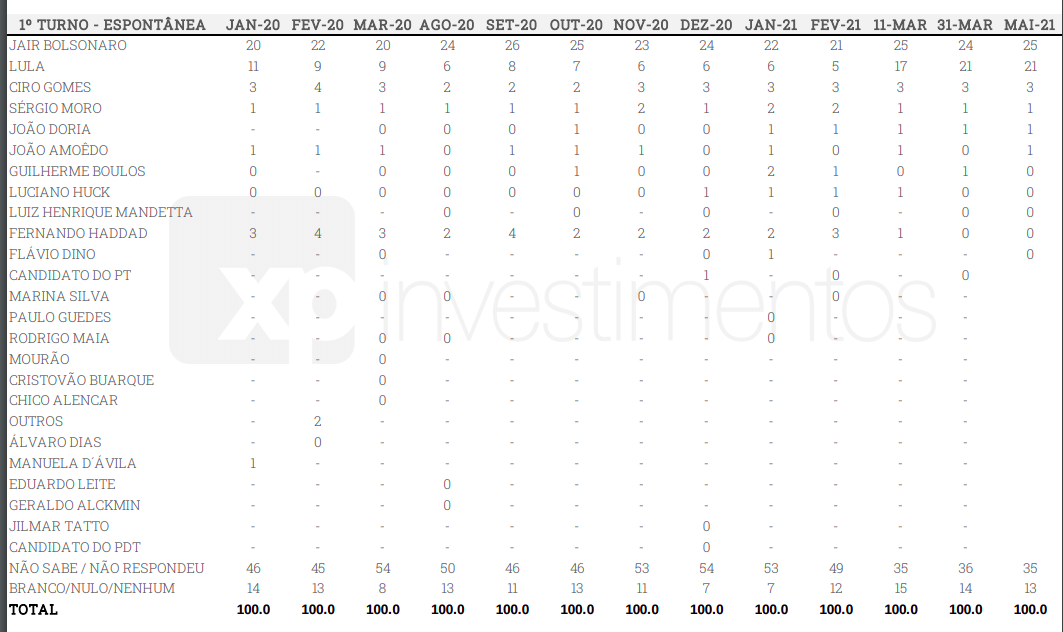 Uma nova pesquisa XP/Ipespe, realizada entre os dias 4 e 7 de maio de 2021 com mil pessoas, e margem de erro de 3 pontos percentuais, confirma algumas tendências já apontadas em outras pesquisas divulgadas recentemente.
