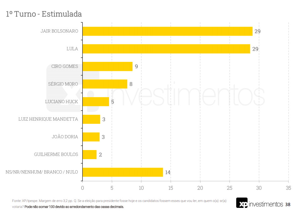 Importante lembrar que Moro e Huck já declararam que estão fora. Talvez não saiam nas próximas pesquisas, e ainda não se sabe para onde seus 13 pontos (somando as duas candidaturas) irão.