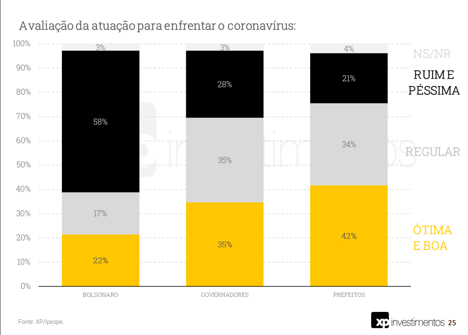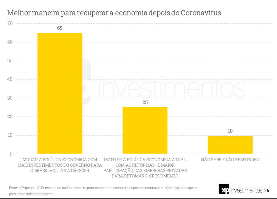 Um ponto interessante na pesquisa é que 65% acham que a melhor maneira de recuperar a economia depois do coronavírus é “mudar a política econômica e fazer mais investimentos públicos para voltar a crescer”. Ou seja, é música para os ouvidos da oposição.