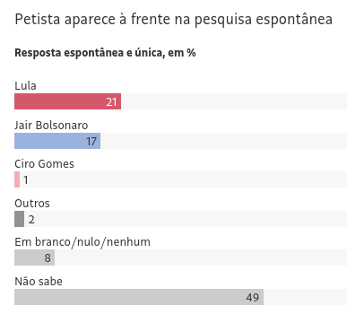 - O petista também lidera na espontânea, com 21% das intenções de voto, contra 17% de Bolsonaro, e 1% de Ciro Gomes. Os outros não pontuam.