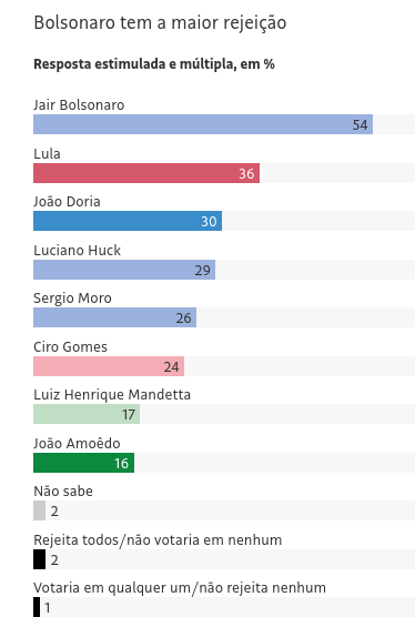 A rejeição de Bolsonaro, um dado importante para avaliar o potencial de voto dos candidatos num eventual segundo turno, chegou a 54%, o que praticamente inviabiliza qualquer possibilidade de vitória do presidente.