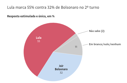 De qualquer forma, as simulações de segundo turno do Datafolha sinalizam uma verdadeira surra eleitoral, com Lula ganhando com 55% dos votos, 23 pontos à frente de Bolsonaro, que pontuaria 32 pontos.