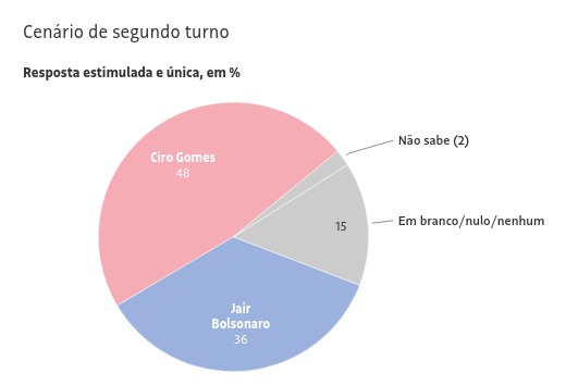 - Bolsonaro também perderia feio de Ciro Gomes no segundo turno, por 48% X 36%, mas esse agora é um cenário mais que improvável.