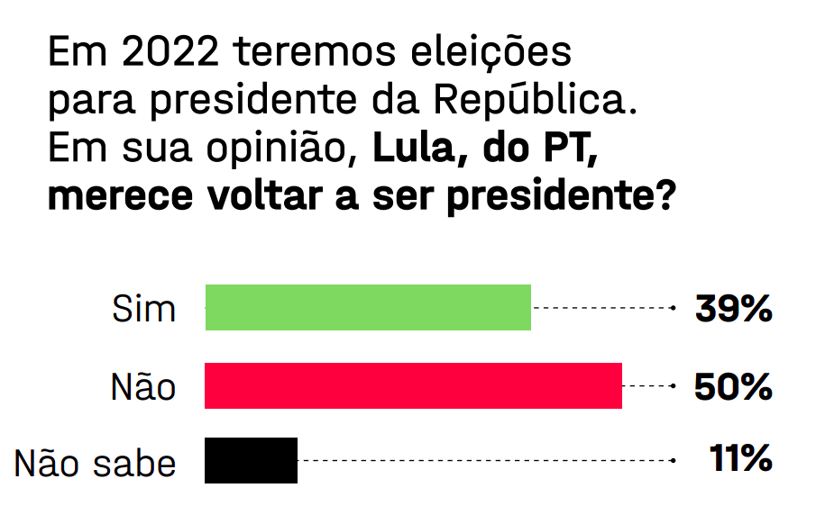 A mesma pergunta sobre Lula traz dados parecidos: 39% acham que Lula merece voltar a ser presidente, ao passo que 50% respondem que não.