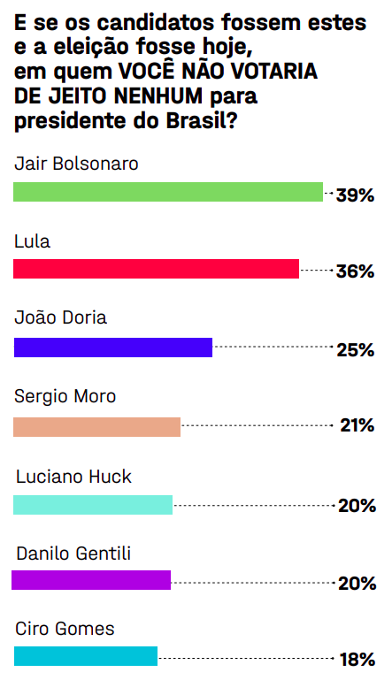 A pesquisa também apurou a rejeição dos candidatos. E aí temos mais um elemento que beneficia Lula, que é o fato de Bolsonaro liderar o ranking de rejeição, com 39% dos entrevistados respondendo que não votariam nele “de jeito nenhum”. Quanto ao próprio Lula, sua rejeição é de 36%.