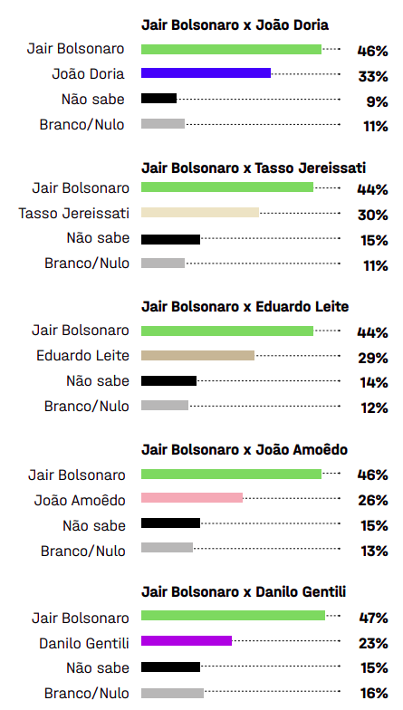Lula lidera em todos os cenários, com percentuais que oscilam de 35% a 37%. Bolsonaro está em segundo lugar, por sua vez, em todos os cenários, com pontuações entre 30% e 33%.