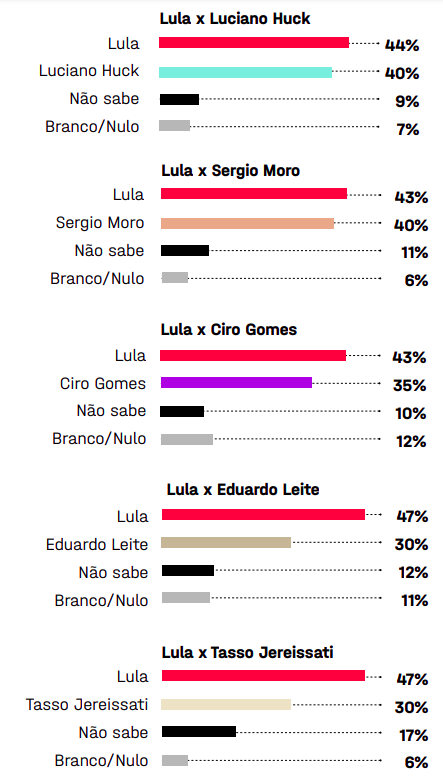 Lula tem situação duplamente privilegiada: 1) apenas o petista ganha de Bolsonaro, e com margem confortável, de 8 pontos de vantagem; e 2) Lula também ganha nas simulações com outros candidatos.