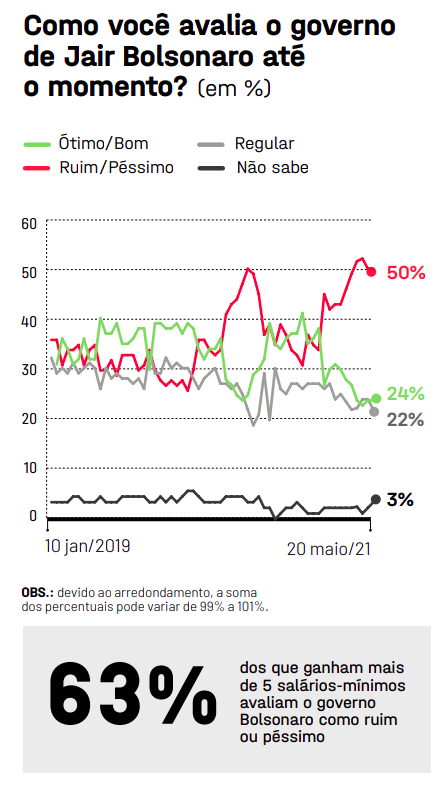 O governo é visto como “ruim/péssimo” para 50% dos internautas, com destaque para a deterioração de Bolsonaro junto às classes médias: entre eleitores com renda familiar acima de 5 salários, a rejeição de seu governo sobe para 63%.