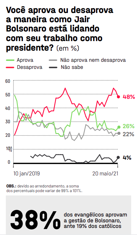 Quanto à aprovação ao desempenho pessoal de Bolsonaro, ele experimentou uma leve melhora, embora ainda seja muito negativa, com a desaprovação caindo para 48% e a aprovação oscilando um ou dois pontos positivamente para 26%.